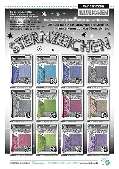 18 Seiten Anleitung mit Beschreibung der Schattenstrick-Technik und 12 Zählmustern für alle Sternzeichen + Bonus-Geschenk "STERNE" · PDF-Datei 6,3 MB