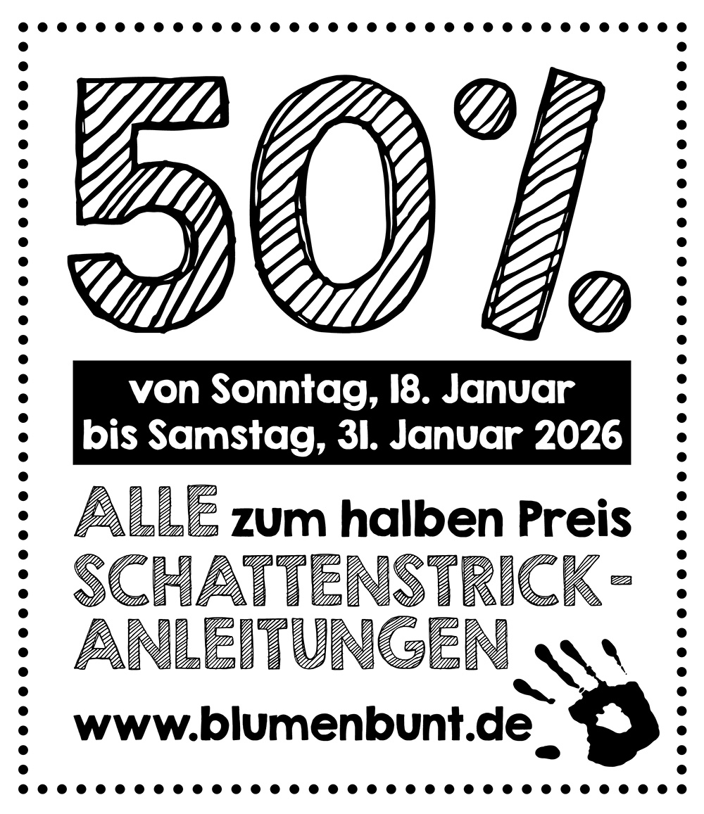 Außerdem findet ihr in meinem BLUMENBUNT-Shop nach wie vor weitere 5 Schattenstrickanleitungen zur Einführung und zum Üben der Technik zum kostenlosen GRATIS-Download.